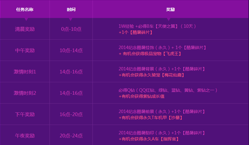 7.19、7.20、7.26、7.27、8.03、8.09、8.10,这7天每天完成15点、16点整点在线任务可分别获得1个【酷暑碎片】;8月02日在任务面板最多可领取5个【酷暑碎片】;全部最多共可获得19个【酷暑碎片】。8月12日-8月20日可以参与兑换任务【周末兑换抢永久A】。