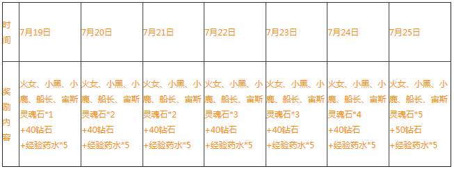 活动内容:从服务器开启后第二天起,连续七天,战队等级高于10级(包括10级)的玩家将在每天中午12:00左右将通过游戏内信箱获得火女、小黑、小鹿、船长、宙斯等灵魂石及其他奖励,每位英雄灵魂石累计获得20个。