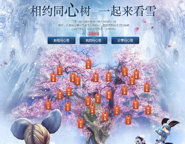 同时为庆祝《剑灵》公测,我们特别推出公测同心树下许心愿活动。7月21日至8月7日,只要玩家帐号中有至少一个满级角色,就可获得一次抽取同心签的机会,每个同心签上会随机出现一个不同的愿望。将同心签链接分享给自己的好友,好友进入页面后选择“绑定该同心签”,即可和邀请人签订看雪誓约,绑定在同心树上。