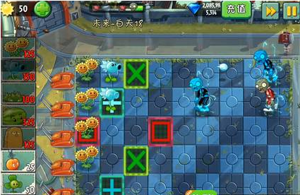 2、寒冰射手的及时补充,如果中间铁桶僵尸乱入进来,记得用窝瓜去砸它,因为寒冰射手需要缓冲时间所以难免会有几排是空着的。