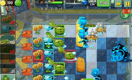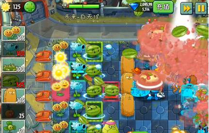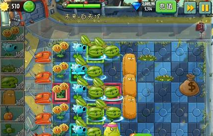 4、最后一波僵尸出现,西瓜投手的就要表现出的它的魅力了,因为500阳光的冰西瓜一开始太难获得了,所以必须用寒冰射手加西瓜投手及时补充。一个大招全砸死他们。