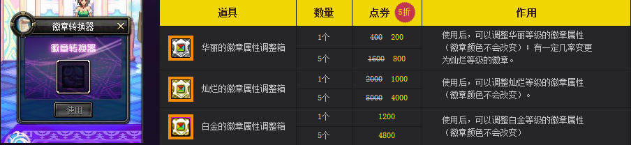 使用后随机调整徽章属性,白金徽章和耀眼的徽章不可使用