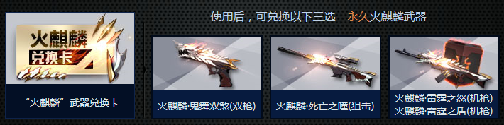 ①“火麒麟”传说系列兑换卡,可兑换1把永久火麒麟武器!