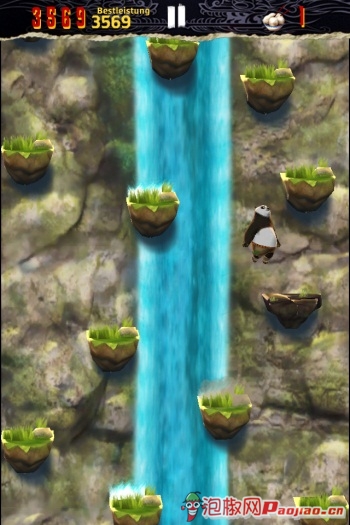 跳跃是熊猫是往上跳,跟涂鸦跳跃差不多,利用重力感应系统,左右切换位置(我感觉更多是三向陀螺向转移),然后才在石头上,往上爬,有些灰色的石头踩到石头就掉落,所要小心,要迅速的切换到有颜色的石头上,至于他跳到哪里,我没有深究,不过我相信,在你没找到答案之前,你已经掉下来了。