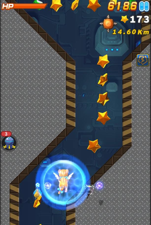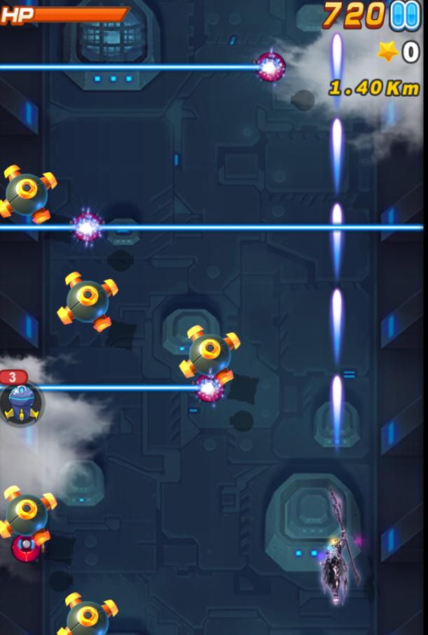 A4:闯关版本中增加了三种更加刺激爽快的关卡,分别是速度关,障碍关,空雷关。速度关与障碍关主要表现为在屏幕左右两侧出现不规则的崖壁,使主机的活动空间所限,需要玩家对主机有精确的操作,防止撞在两侧的崖壁上。障碍关的屏幕滚动速度较慢,甚至会比正常的滚动速度还慢, 但是障碍会很多,需要依靠精细的操作躲过层层障碍。速度关崖壁路线会相对较简单,障碍也略少,但是屏幕滚动速度很快。需要极快的反应能力才能化险为夷。在空雷关中,我们不仅要小心躲开四周发射的激光,还要注意空雷被击毁后会自爆向四周发射一次子弹,甚至主机进入空雷警戒范围后会激活其自杀行为,追踪主机进行撞击。
