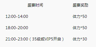 公测期间,玩家可于12:00-14:00、18:00-20:00参加盛宴,狂享50体力补给。当玩家达到35级(战队等级)或VIP5时,更可于21:00-23:00享受豪华夜宵,30体力补给