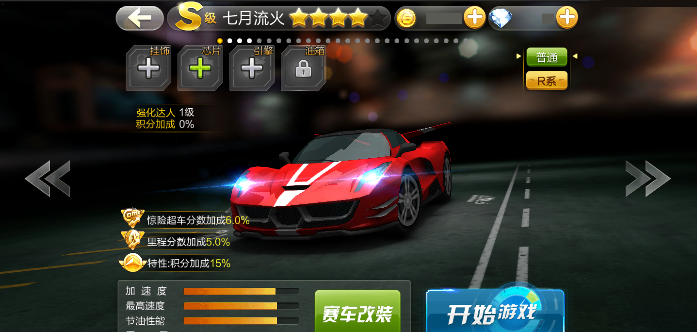 S车七月流火是天天飞车的第三辆双技能S车,这两个技能分别是里程分数加成5.0%和惊险超车分数加成6.0%。
