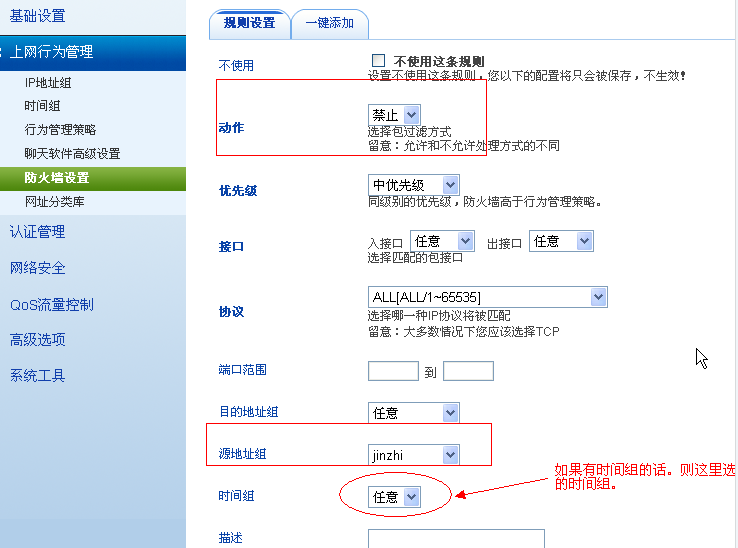3.启用上网行为管理--防火墙添加新规则:动作 禁止,接口 任意,源地址 就是禁止组。保存即可。(如下图所示)
