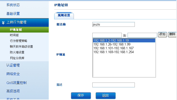 2,选中上网行为管理的界面,点开IP地址组,添加新规则。推荐建立一个三个字符以上的英文组名称,同时把禁止上网电脑的IP地址放进去,允许上网的电脑如果不限制可以不添加IP组。比如网管的IP是192.168.1.100不受限,老总的IP是192.168.1.168不受限。经理组192.168.1.20-192.168.1.25不受限。其他都禁止上网为例。设置的规则需要灵活处理,注意:IP地址不能重复。