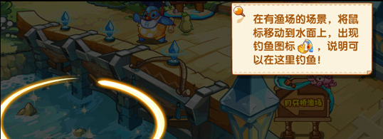 5、然后,学习完钓鱼的技巧,我们就开始我们的钓鱼之旅吧!点击鱼竿,按住鼠标左键来移动鱼竿到波纹的位置上方,控制力道进行抛竿