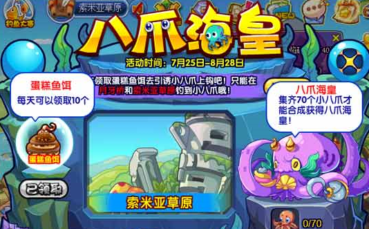 1、使用蛋糕鱼饵去月牙桥或索米亚草原钓鱼,有几率钓到小八爪。蛋糕鱼饵可以在八爪海皇活动中领取,每天只能领取10个。