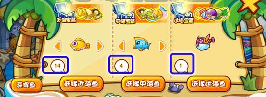 二、活动中需要的鱼都是通过钓鱼获得的哦!手中鱼的星级越高,能够探索的宝箱距离越远!数字代表你能探险的次数(和你拥有的鱼有关)
