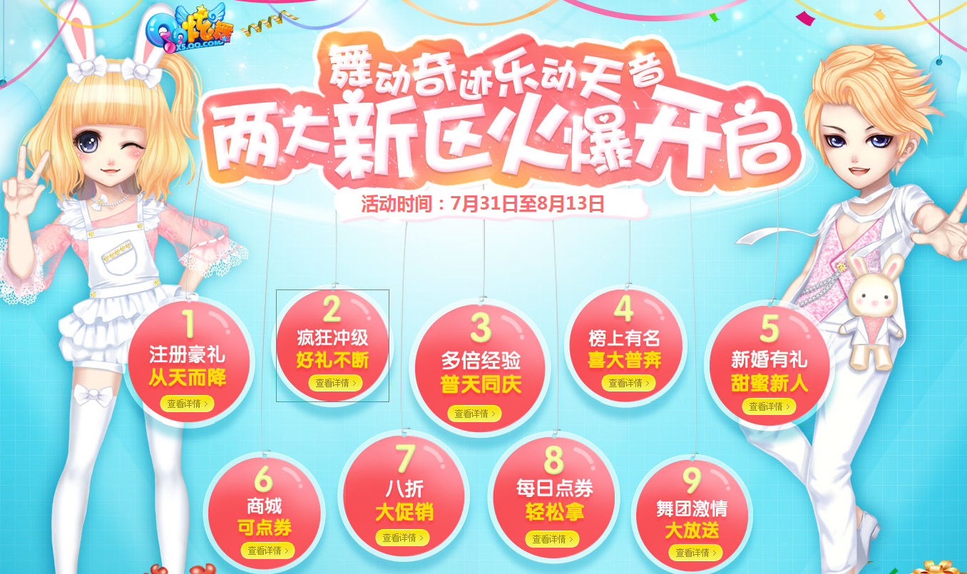 qq炫舞两大新区即将要开启了——舞动奇迹和乐动天音。为庆祝舞动奇迹和乐动天音的开启,qq炫舞特在7月31日-8月13日举办9大活动,注册角色即可获得精美套装,花花公子之杖,稀少咪小白,稀少喵小黑,还有四倍经验、四倍G币、四倍唱歌经验、四倍舞团资源、双倍工资、双倍心动、双倍宠物经验、双倍每日任务奖励。下面东坡小编给大家详细介绍活动详情吧。
