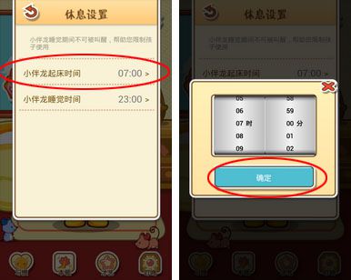 3.小伴龙默认的起床、睡觉时间分别是早上7点、晚上11点,点下图红圈内的时间,在弹出的框里可以修改时间。想让小伴龙什么时候起床、睡觉,由你来设置。