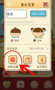2.在“家长设置”里点下图中红圈内的“休息设置”,可以修改小伴龙的休息时间。