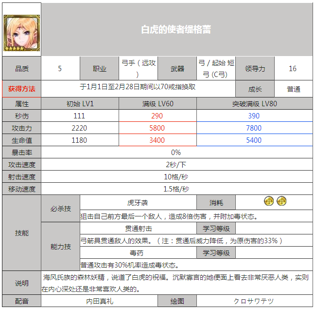 《锁链战记》的很多小伙伴最近经常问的一个问题是“锁链战记缇格蕾怎么样?”,下面就和小编一起来看看关于白虎的使者缇格蕾的介绍图鉴吧!