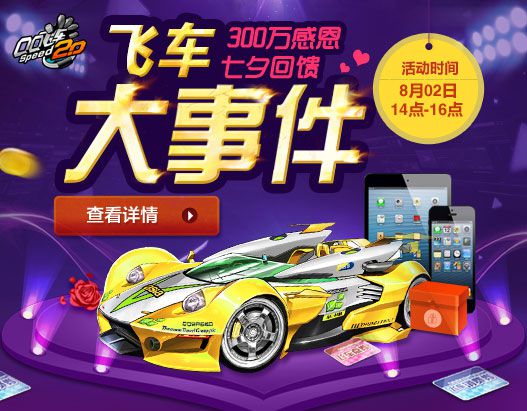 8月2日飞车大事件七夕回馈即将登场,飞车史上最丰富豪华的回馈阵容,你有信心把它抱回家吗?考验人品的时候到了,我们8月2日不见不散!