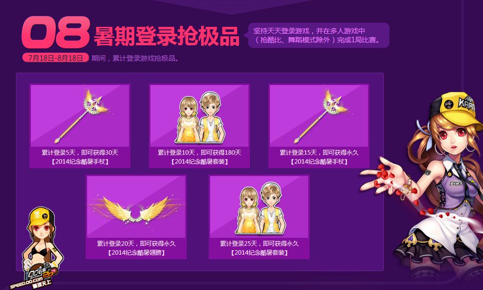 计登录20天,即可获得永久【2014纪念酷暑翅膀】、累计登录25天,即可获得永久【2014纪念酷暑套装】。