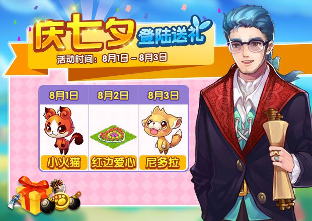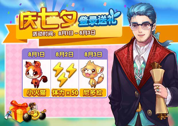 七夕将至, 8月第一波精彩活动来袭,大量福利等你来领!登录送好礼、双倍经验活动、限时体力免费领,更有重磅推出的100%碎片掉率,这么多精彩活动,快带上心爱的TA,一起来全民精灵和可爱的精灵们来一次七夕约会吧!