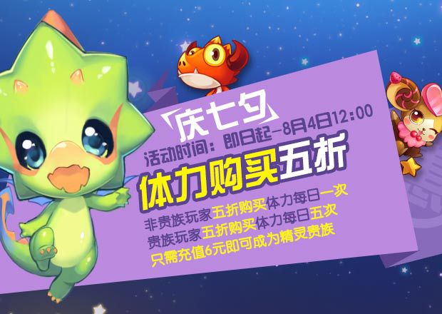 即日起至8月4日12:00,享受体力购买五折优惠,非贵族玩家五折购买体力每日一次,贵族玩家五折购买体力每日五次,只需要充值6元即可成为精灵贵族哦,前所未有的折扣福利还在犹豫什么,快点行动起来吧!