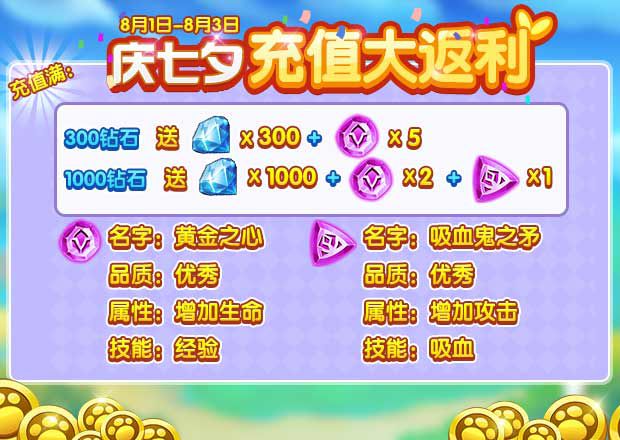 8月1日至8月3日期间,累积充值300钻石和1000钻石即有大量好礼相送,安卓用户可领取钻石加紫色符文奖励,ios用户可领取钻石、万能碎片和体力药水奖励,如此丰厚的奖励只有七夕活动才有!