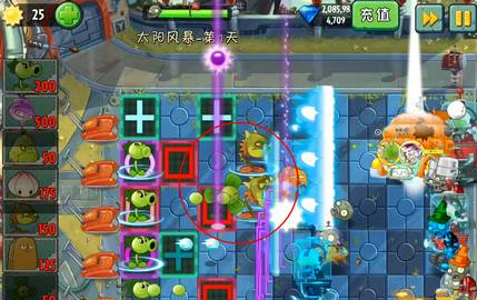 2、前期的阳光尽量都收集使用,强化瓷砖放在有双重射手的格子上面,因为能量豆必须依靠强化瓷砖的强大,这样才能完美输出。