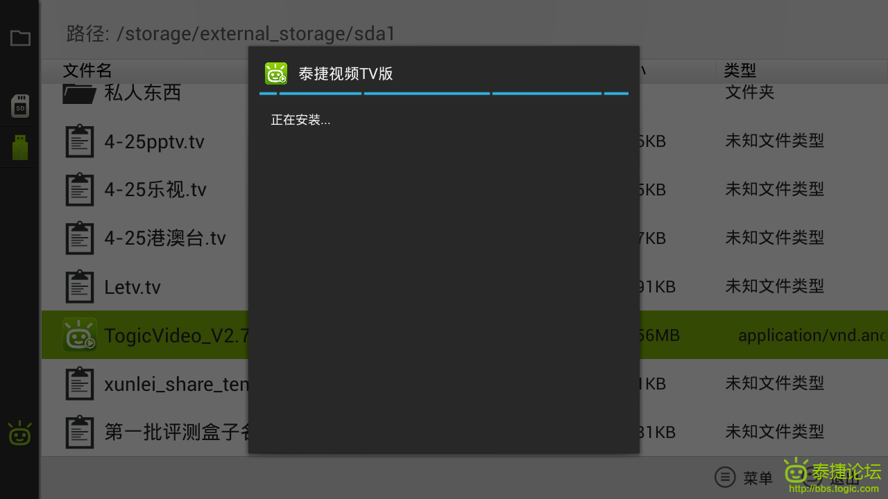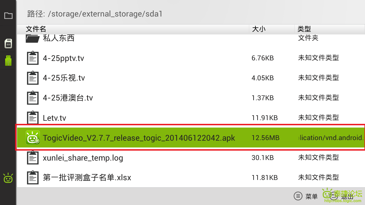 2.找到sda1,遥控器左键选择sda1,找到泰捷视频apk,