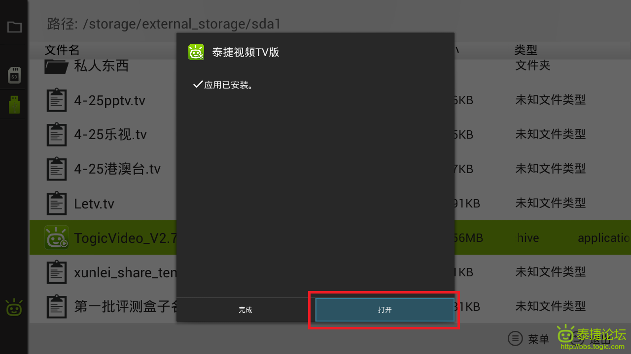 3.遥控器ok键,安装泰捷视频apk,安装成功之后选择“打开”;