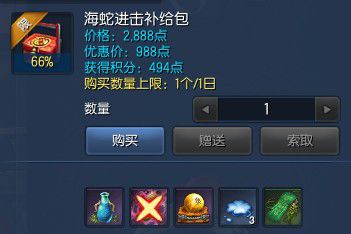 3、第三种获取方法是在游戏商城售卖的海蛇进击补给包中有3个耀眼的水月水银,礼包价格2888点券,优惠价988点券。