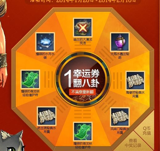 1、在之前的幸运八卦活动(查看活动地址)中,玩家可以通过转盘获取,活动时间:2014.01.20-2014.02.10