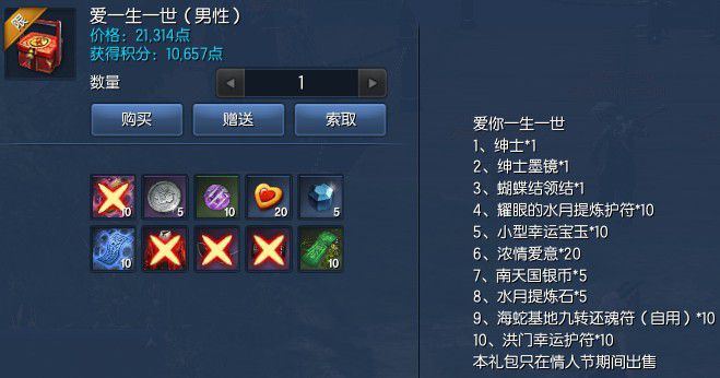 2、第二种获取方法是在即将到来的情人节活动中,通过游戏商城售卖的“爱一生一世礼包” 中获取,礼包价格21314点券,里面包含3个耀眼的水月水银。