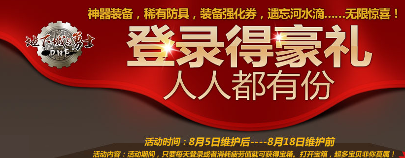 dnf登录得豪礼活动在8月5日开启,活动期间只要每天登陆游戏或者消耗疲劳值就可获得皇女的传世宝箱和皇女的神秘宝箱,下面东坡小编给大家详细介绍活动内容吧。