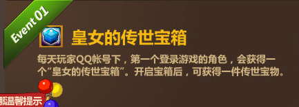 每天玩家QQ帐号下,第一个登陆游戏角色,会获得一个皇女的传世宝箱。开启宝箱后,可获得一件传世宝物。