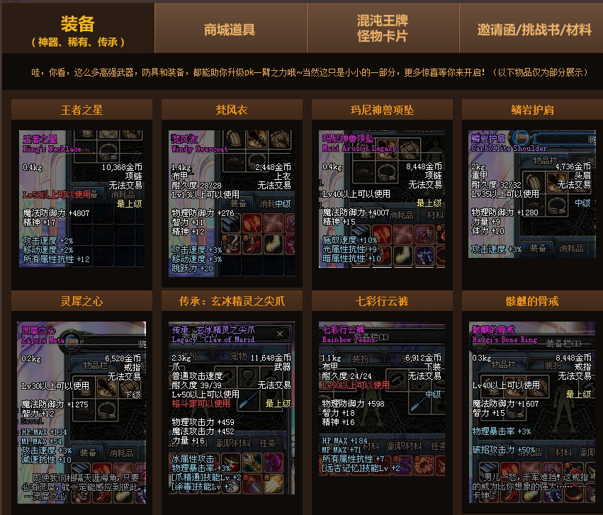 哇,你看,这么多高强武器,防具和装备,都能助你升级pk一臂之力哦~当然这只是小小的一部分,更多惊喜等你来开启!(以下物品仅为部分展示)