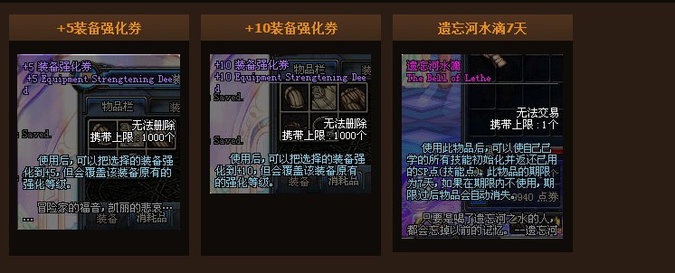 除了装备强化券和遗忘河水滴,还有雷米的援助和魔力果汁呢,商城道具缤纷闪耀~(以下物品仅为部分展示)