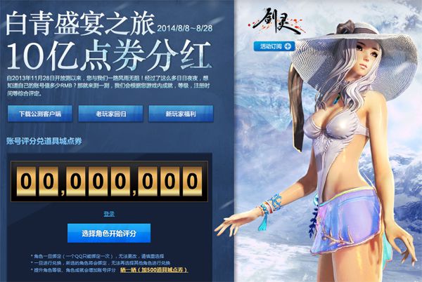8月8日至8月28日,《剑灵》白青盛宴之旅将开放“10亿点卷分红”,玩家在活动页面可选择账号下所有角色进行评分,但确认角色兑换点卷后将绑定所选角色,无法再选择其他角色进行兑换。活动中,玩家角色评分和道聚城绑定点卷兑换率为1:1,并且玩家在活动期间提升角色等级、角色成就等还能增加账号评分,以及可通过新开蓝钻、分享评分等方式增加道聚城点卷数额。活动期间,所有角色兑换成道聚城绑定点卷达到40000,还能领取游戏人生纪念荣誉。