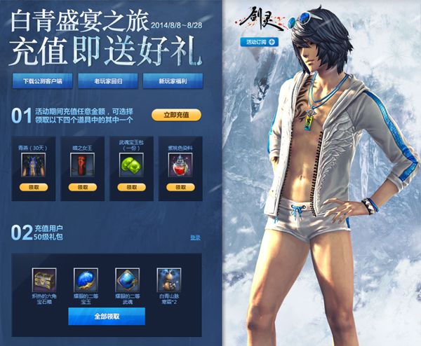 8月8日至8月28日,所有《剑灵》玩家可在公测版本中通过打怪掉落“白青盛宴邀请函”,在活动页面可兑换成相应活动积分,达到一定积分可领取活动奖励。活动期间,所有Q币类奖励仅限8月6日之后注册的玩家可领取,数量有限先领先得,8月6日前注册的玩家也可领取包括夏日海洋(30天)在内的游戏道具类奖励。Q币旅行基金与网吧送网费绑定角色互通。