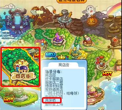 1、打开大地图,找到商店街!可以看到,在商店街的场景中就有我们要去的月牙桥哦!