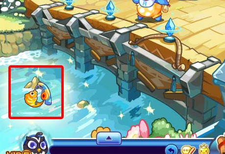 3、最后来到月牙桥,移动鼠标到左下角的水面上,当水面上出现鱼的图标的时候,就可以点击进入钓鱼场景啦!