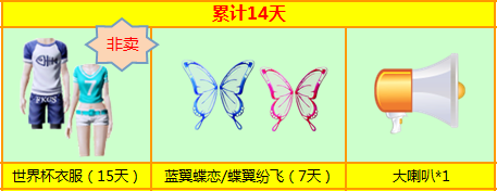 累计签到14天奖励更丰厚!足球迷们,你们有福啦!累计签到14天,我们为您献上人气非卖套装——世界杯衣服!非球迷玩家也不要沮丧噢,我们同时还会赠送高端飞行翅膀蓝翼蝶恋/蝶翼纷飞。