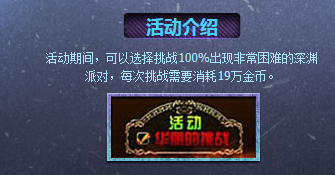 活动期间,可以选择挑战100%出现非常困难的深渊派对,每次挑战需要消耗19万金币。
