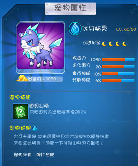 冰牙精灵可由碎片合成,宠物碎片闯关模式中只会在BOSS关卡掉落,当然也有随机隐藏关卡掉落。