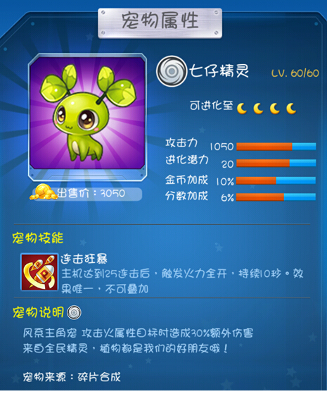 风系主角宠,攻击火属性目标时造成30%额外伤害,连击狂暴——主机达到25连击后,触发火力全开,持续10秒。效果唯一,不可叠加。