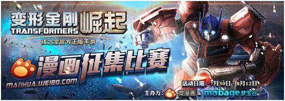 由DeNA研发、孩之宝官方授权的正版手游《变形金刚:崛起》即将在8月6日迎来震撼公测!在游戏来临前夕,为了让广大TF粉丝提前享受变形金刚系列的独特魅力, DeNA旗下知名游戏社交平台梦宝谷联手国内专业原创漫画网站微漫画,为TF迷们量身打造了《变形金刚:崛起》漫画征集大赛,小伙伴们还不快来描绘自己心中的变形金刚!