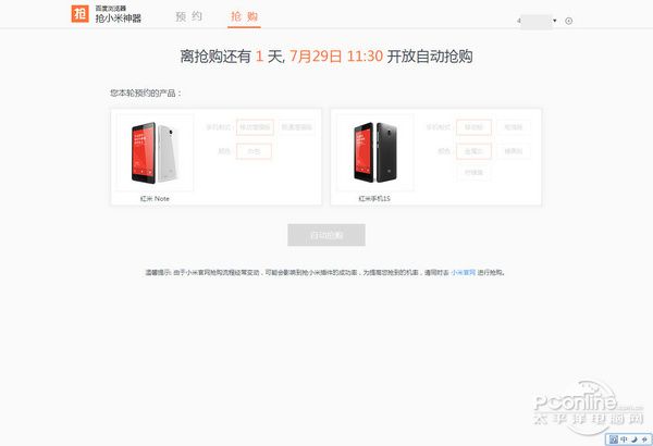 填写完毕就可以在抢小米神器的抢购页面中看到本轮预约的产品,当前的“自动抢购”按钮还是灰色的,要等抢购日的11:30才开启。嗯,这里很不自信的友情提示用户要做两手准备。