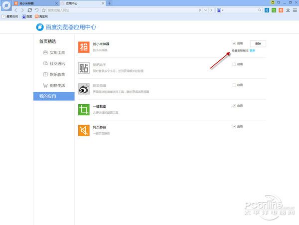 接下来万事具备,只欠抢购了。到了29日上午11点,笔者打开百度浏览器,进入抢小米神器抢购页面,依旧没有小米4的踪影,再去官网看看,还是那个版本。终于在百度浏览器的“我的应用”界面中看到了“抢小米神器”的更新提示,坑爹啊,哪里都没插件更新提示,差点就用旧版插件去测试了。