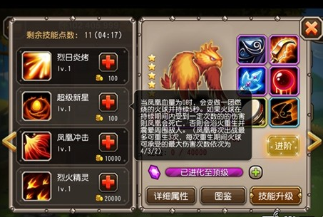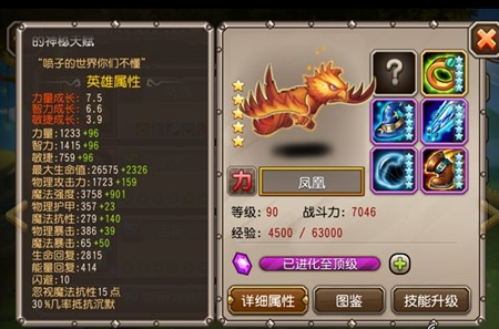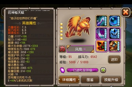 凤凰这个英雄初始就有两星,这点和刚背猪以及人马一样,可以通过后面得到的灵魂石进行升级。初始的三围属性还不错,力量3.75、敏捷1.95、智力3.3。凤凰在游戏中是一个中排力量型的法师,技能比价变态。它有着这样一个技能可以通过消耗自己的血量对对手的队伍造成极高的伤害,当它的血量耗尽时,还能化作凤凰蛋涅槃重生。这点证明了它的强悍之处,拥有不死之身。