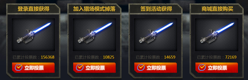 活动期间,最终投票数最高的选项将成为最新最酷近战武器"逆光之刃"的获得方式,你的武器由你做主!每个选项的投票总数显示会有一定延迟!