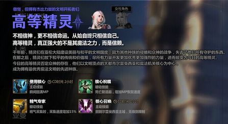 高精作为玩家们最喜爱的一个种族,有着美丽的外表,和高贵的气质。直觉告诉我们高精适合法系职业,这是正确的,从“使用核心”这个技能就能够看出来,顺满MP(CD,2小时是十分的坑爹的啊,所以在使用这个技能的时候要谨慎啊!!!)