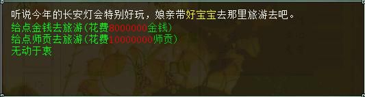 玩家在宝宝养育界面点击“卖萌”或者“旅游”两个操作时候,将可以使用师贡进行支付。